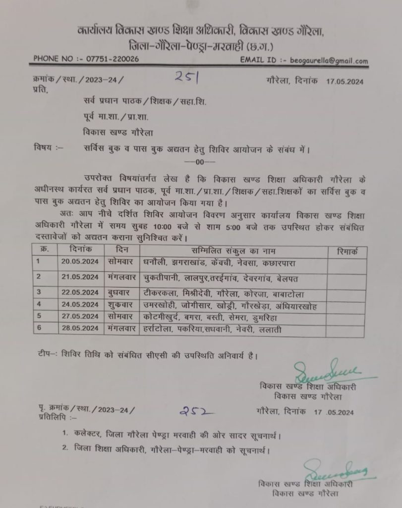 इस संबंध में गौरेला ब्लॉक के बीईओ डॉक्टर संजीव शुक्ला ने ब्लॉक के सभी मिडिल स्कूल एवं प्राइमरी स्कूल के सभी प्रधान पाठक, शिक्षक और सहायक शिक्षक को पत्र जारी किया है कि संबंधित शिक्षक निर्धारित तिथि एवं निर्धारित समय में बीईओ कार्यालय में उपस्थित होकर अपनी सेवा पुस्तिका और पासबुक का संधारण कराना सुनिश्चित करें।